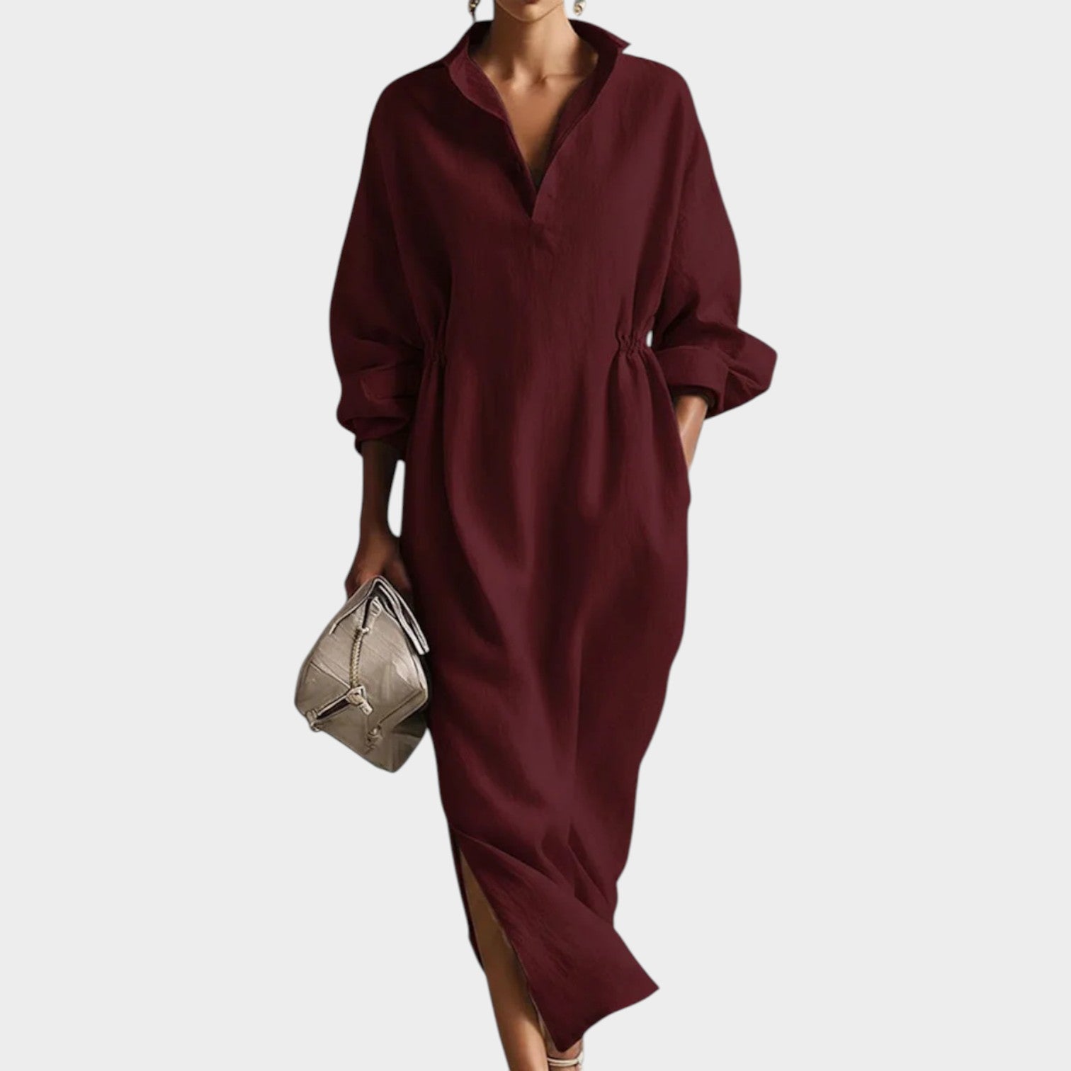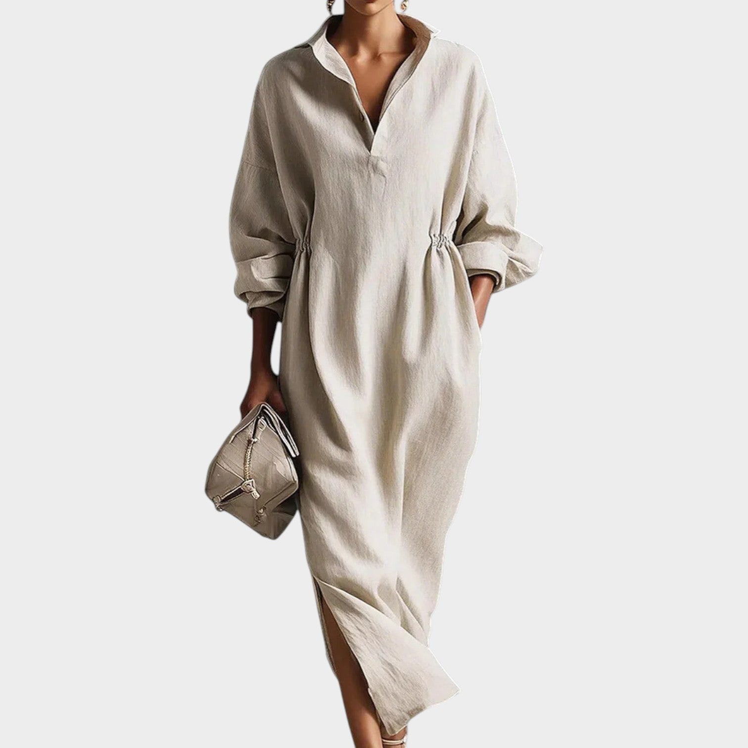 Elegant Pleated Lapel Waisted Long-sleeved Maxi Dress