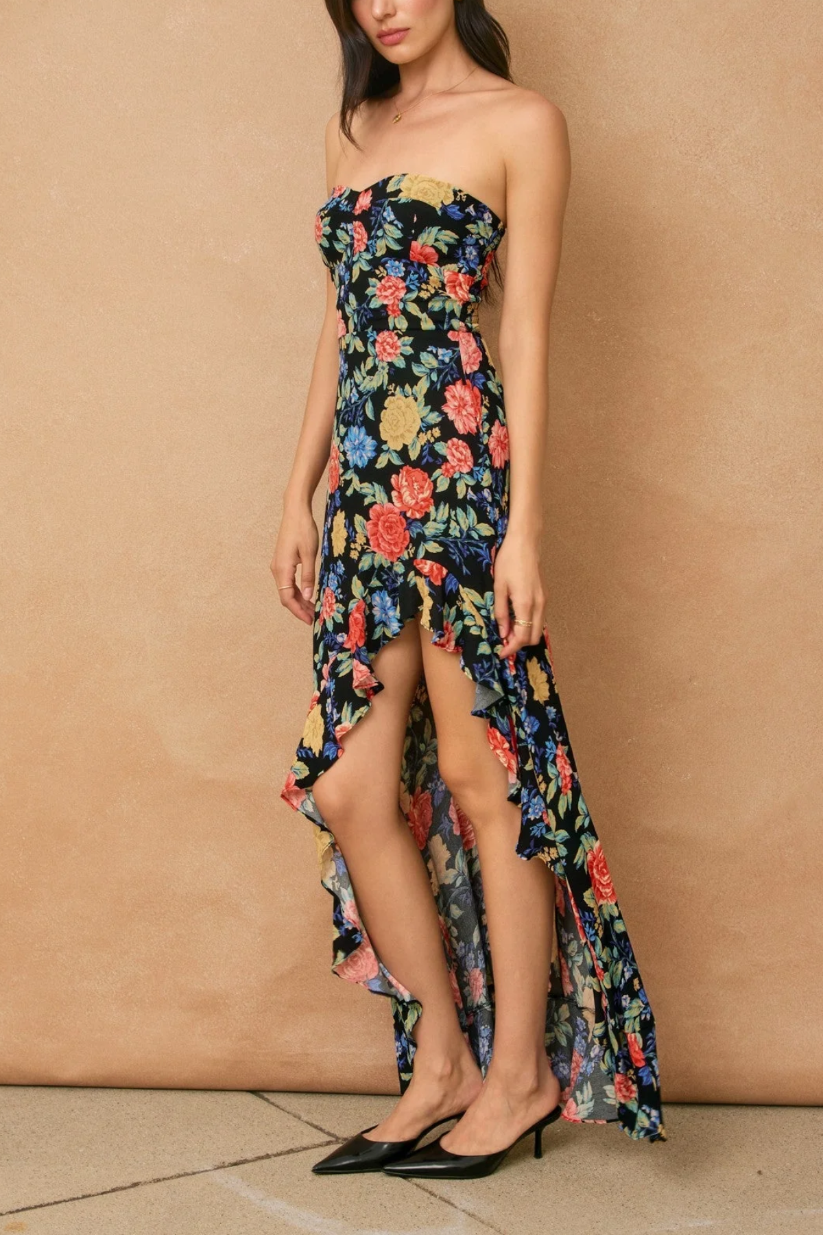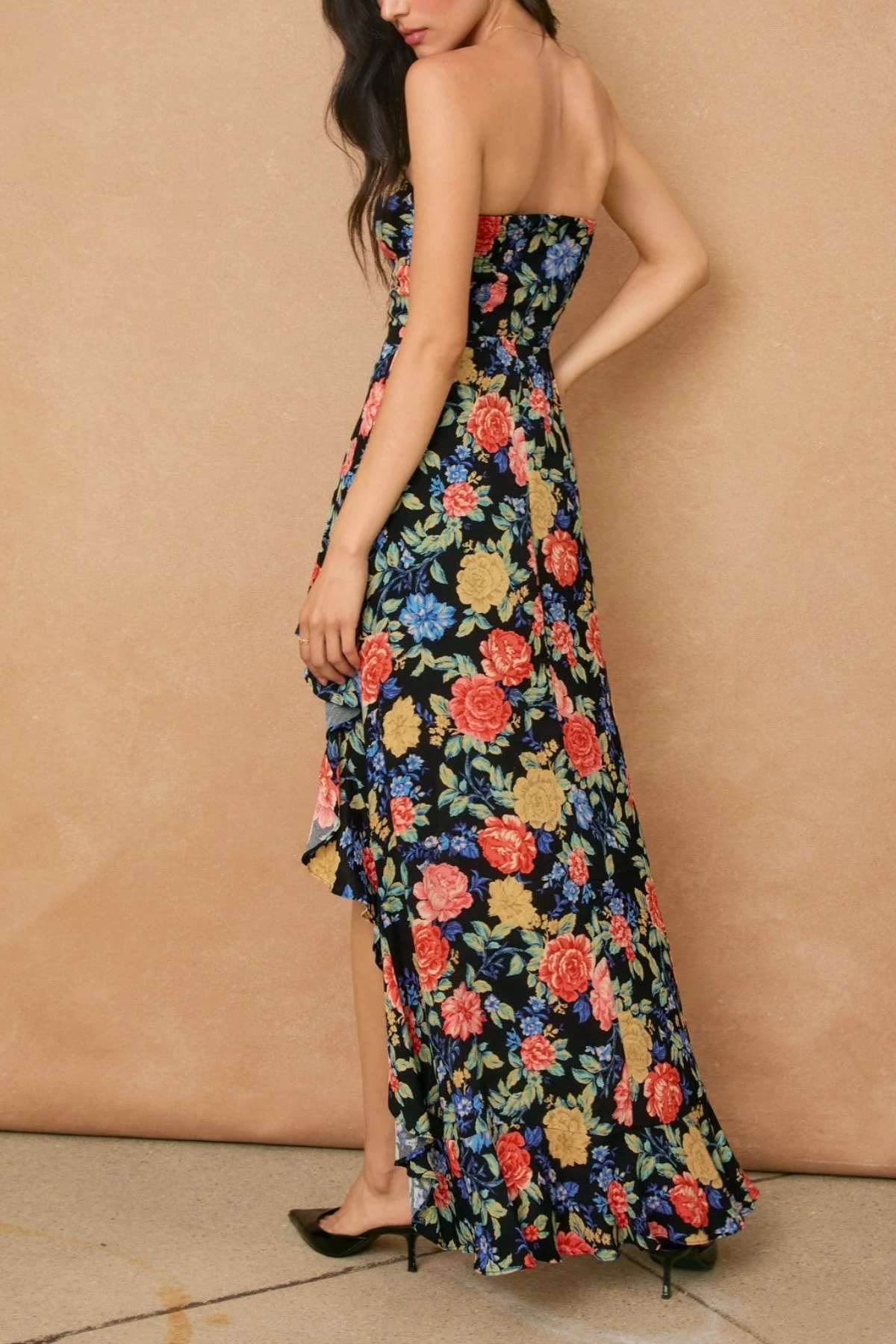 The Au Revoir Empire Asymmetrical Maxi Dress: a strapless stunner with vibrant floral prints (black base + bold blooms). Its empire waist and ruffled high-low hem blend romance and allure—perfect for dates or events. Pair with heels for a showstopping, effortless look.