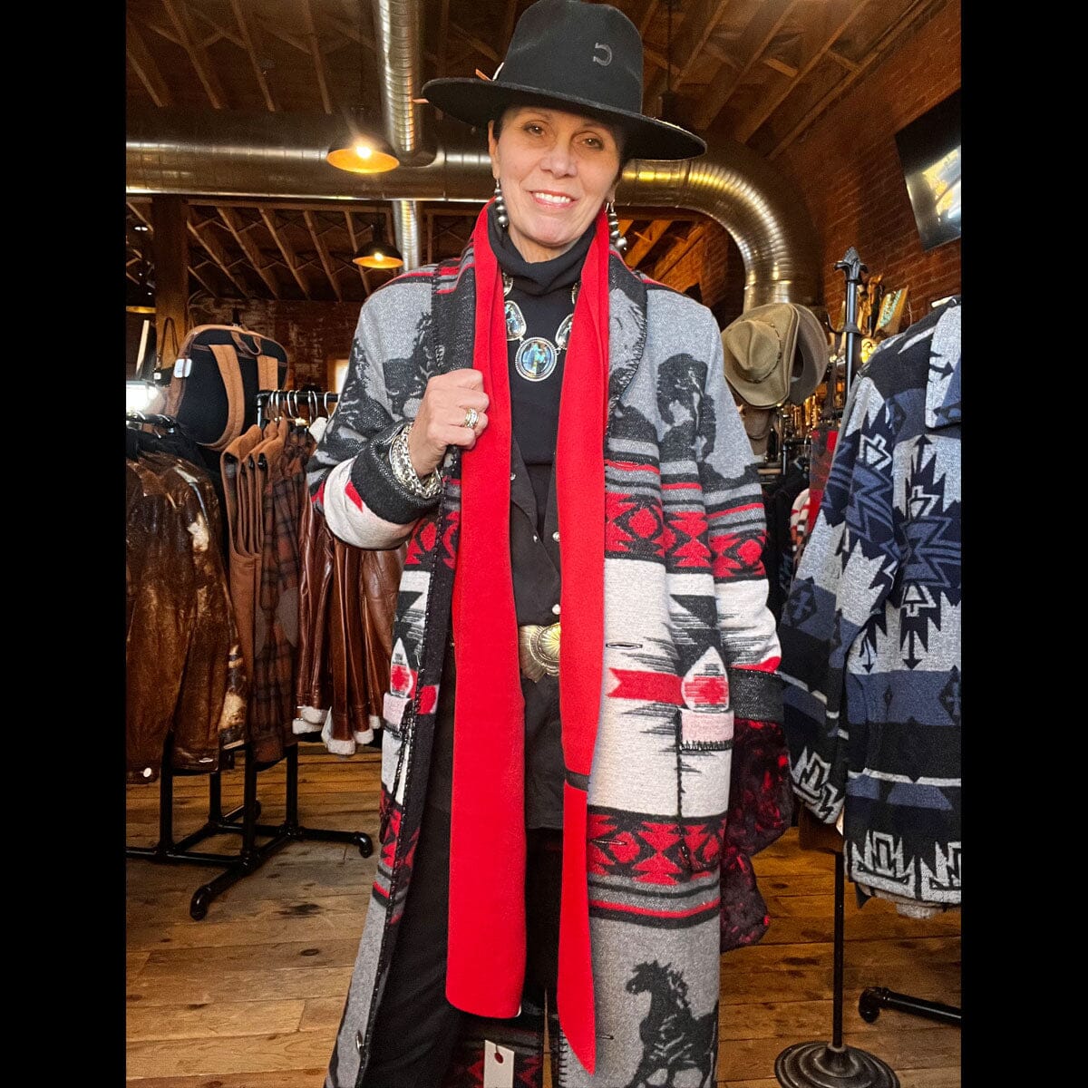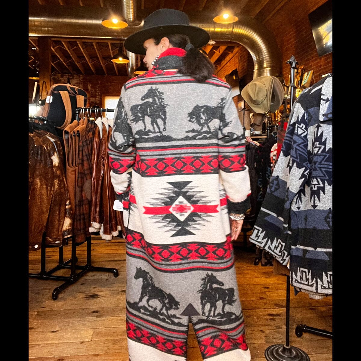 This STROLLER is a wool blend generous fit unlined mid length (42" center back finished length) Stroller Coat. Shawl collar, 4 concho buttons, turn back sleeve, matching patch pockets & blanket-stitch finish.