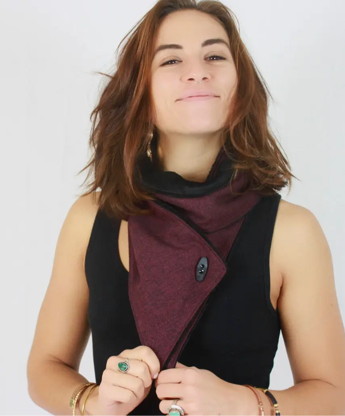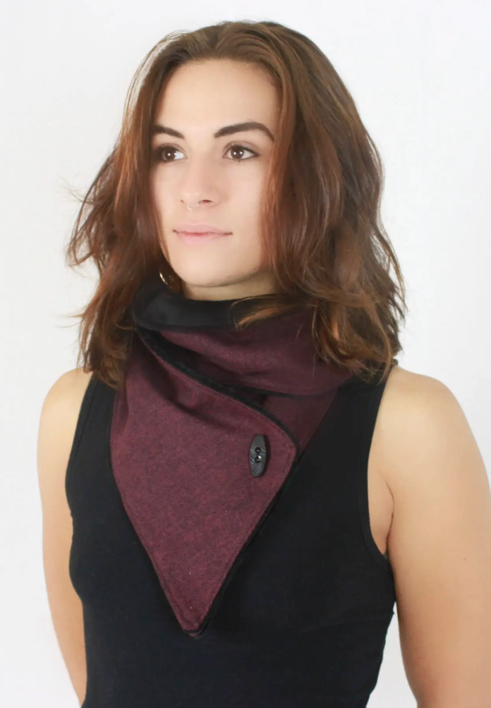 Bandana style, adjustable scarf made with wool and faux sherpa on the reverse side & stabilized with leather on each end with snaps.