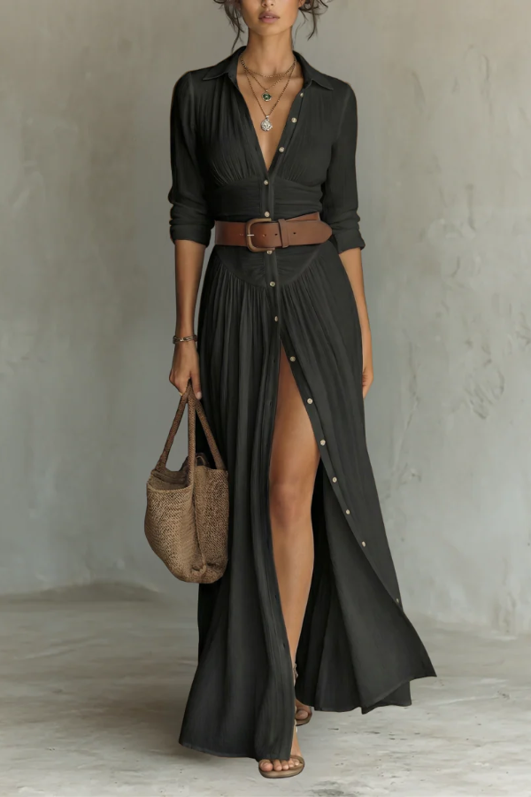 This casual H-line button-down maxi dress with a shirt collar features clean, flowing lines, comfortable wear, and a modern, minimalist style. The crisp collar, full button front, and relaxed, draping silhouette make it ideal for everyday wear, travel, or a casual weekend look.