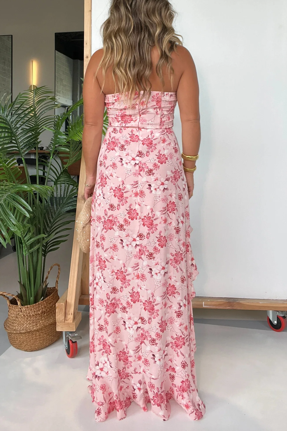 The Delicate Timing Floral Maxi Dress (Blush) is a dreamy strapless stunner: soft pink base with dainty floral prints, plus a ruffled high-low hem for romantic movement. Perfect for brunches, weddings, or sunset dates—pair with strappy heels and a woven bag (like shown) for a breezy, feminine vibe. Lightweight fabric keeps you comfy while looking effortlessly chic.