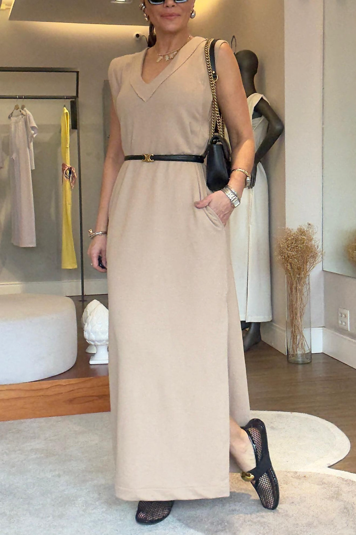 The Giovana Dress is the epitome of casual elegance. This sleeveless maxi features a flattering V-neckline, functional side pockets, and a subtle side slit for effortless movement. Made from soft, breathable fabric, it’s perfect for everyday wear—pair it with sneakers for a laid-back look or dress it up with sandals for a weekend brunch.