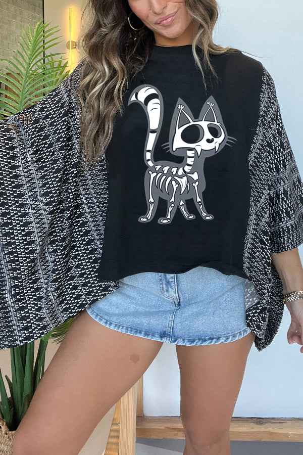 The positive cat bone print combines cute cats with skeletal elements, creating an adorable yet slightly quirky style. It stands out from conventional prints and aligns with young people’s pursuit of individuality and interest in fun elements, making outfits pop effortlessly. The loose fit design offers strong inclusivity for various body types, ensuring comfort and ease of wear, and is suitable for different body shapes, meeting consumers' demands for both comfort and aesthetic appeal.