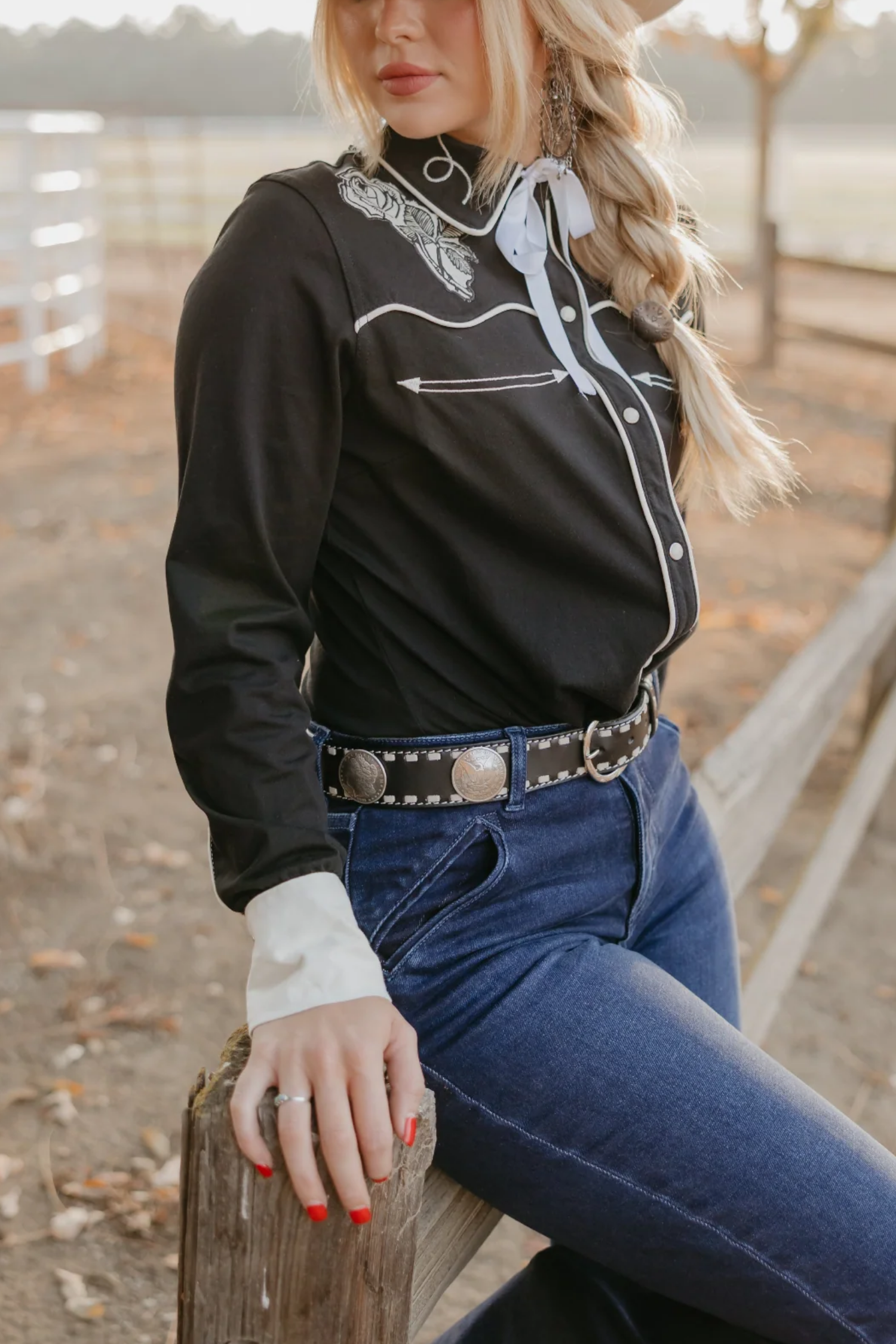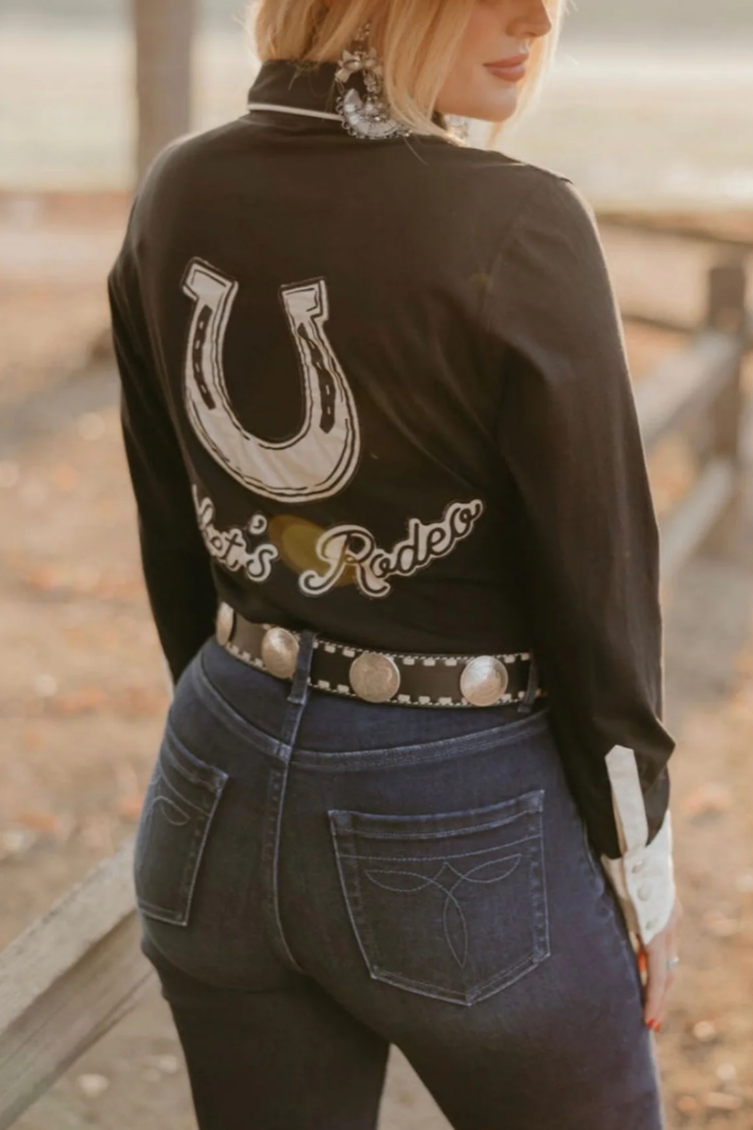 The Let’s Rodeo Button Up is a sharp, statement-making classic with a Rodeo Quincy twist. With pearl snaps, intricate embroidery on the collar and shoulders, and a bold horseshoe and “Let’s Rodeo” stitched on the back, this black beauty is ready for the spotlight. It's made for late nights, bright lights, and cowgirls who always make an entrance.