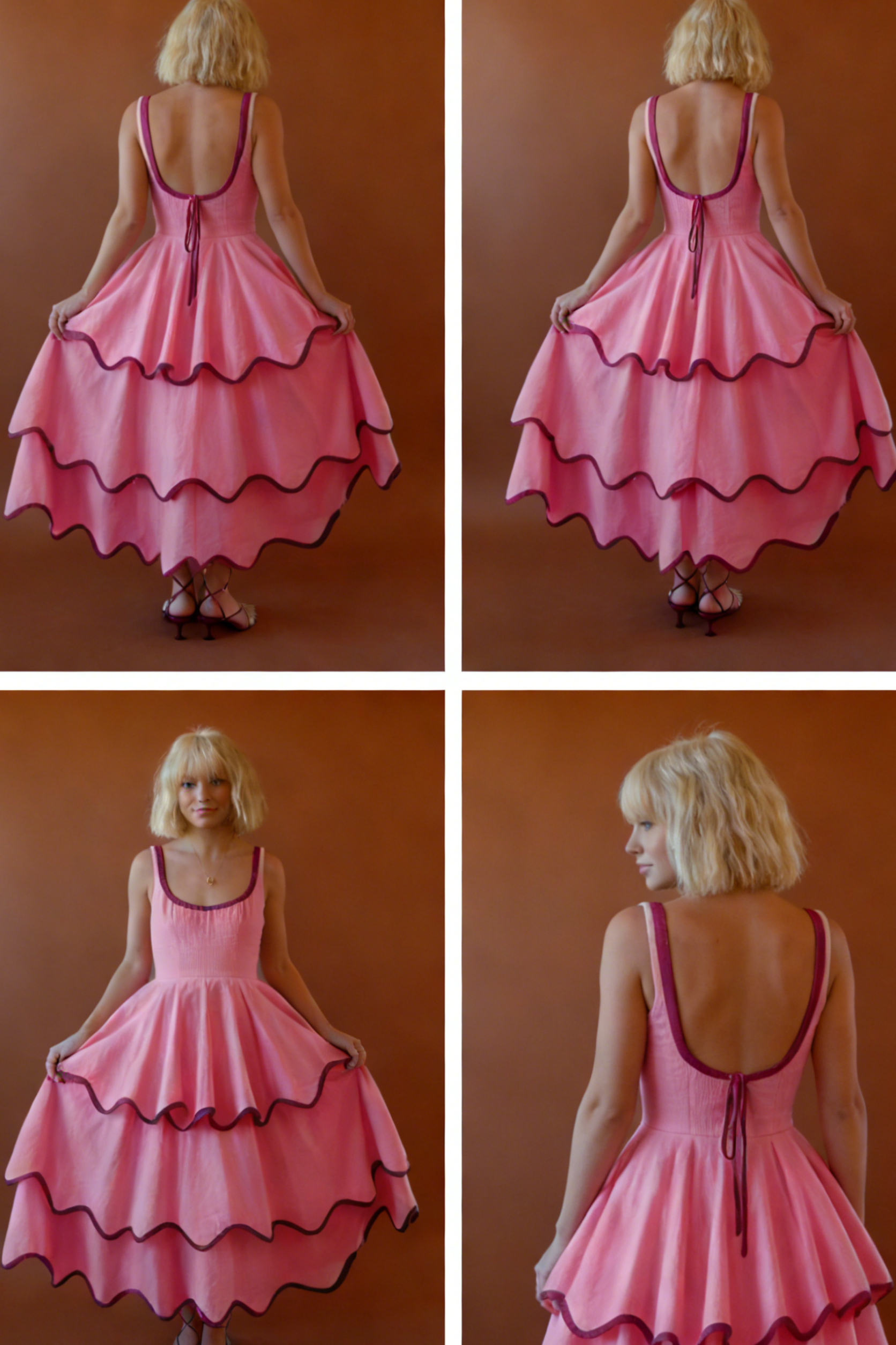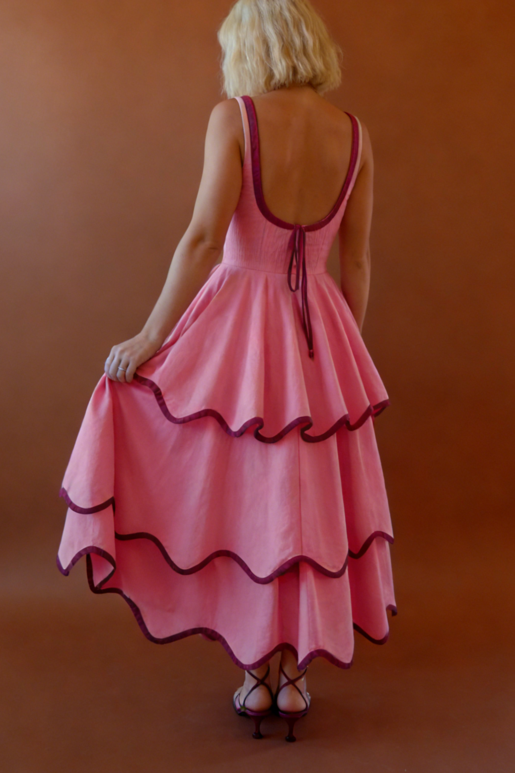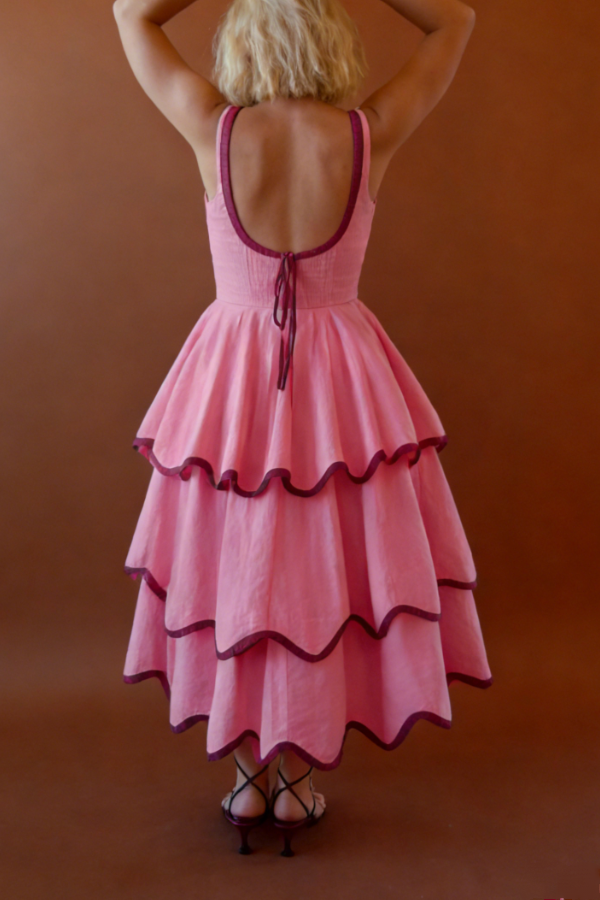 Featuring a three-tiered skirt with a circular cut, the dress boasts a full and voluminous silhouette that flows beautifully when twirling. The multi-layered, voluminous skirt creates an airy feel when moving, preserving the elegance of vintage dresses while adding a touch of sexiness with its open-back design. Each layer of the skirt is finished with a dark green trim, showcasing exquisite handcrafted details and elevating it beyond the ordinary long dress. The fabric drapes well and is wrinkle-resistant, ensuring both comfort for everyday wear and a sophisticated look for going out. The fitted bodice is lined, and the drawstring round neckline is adjustable for a comfortable and secure fit. Exquisite contrasting stitching highlights the delicate details of the princess-seam bodice, while invisible side pockets and a hidden zipper combine simplicity with practicality.