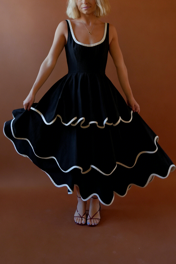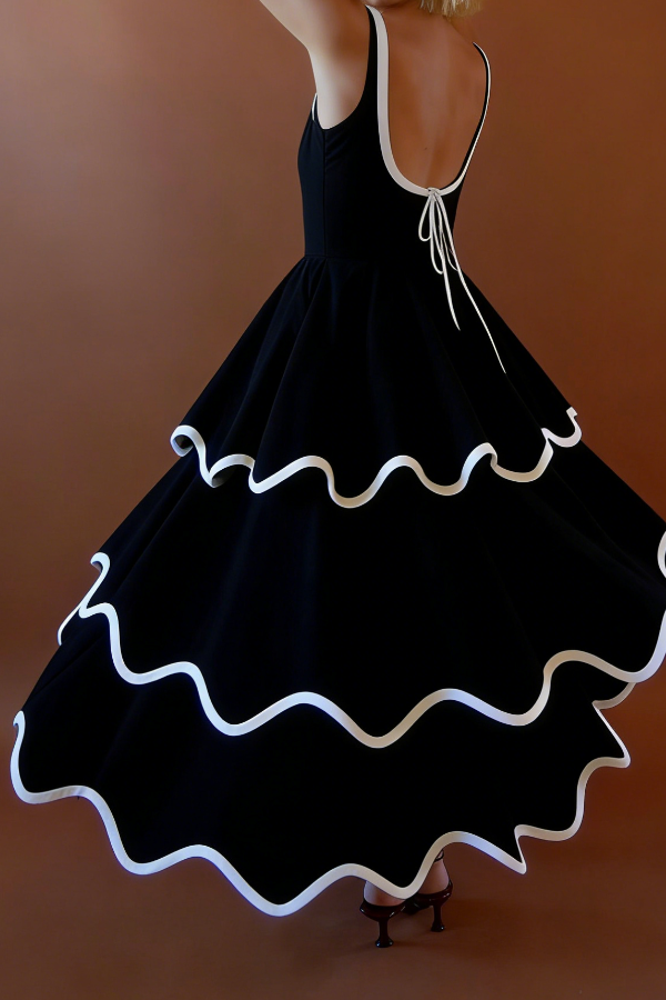 Featuring a three-tiered skirt with a circular cut, the dress boasts a full and voluminous silhouette that flows beautifully when twirling. The multi-layered, voluminous skirt creates an airy feel when moving, preserving the elegance of vintage dresses while adding a touch of sexiness with its open-back design. Each layer of the skirt is finished with a dark green trim, showcasing exquisite handcrafted details and elevating it beyond the ordinary long dress. The fabric drapes well and is wrinkle-resistant, ensuring both comfort for everyday wear and a sophisticated look for going out. The fitted bodice is lined, and the drawstring round neckline is adjustable for a comfortable and secure fit. Exquisite contrasting stitching highlights the delicate details of the princess-seam bodice, while invisible side pockets and a hidden zipper combine simplicity with practicality.