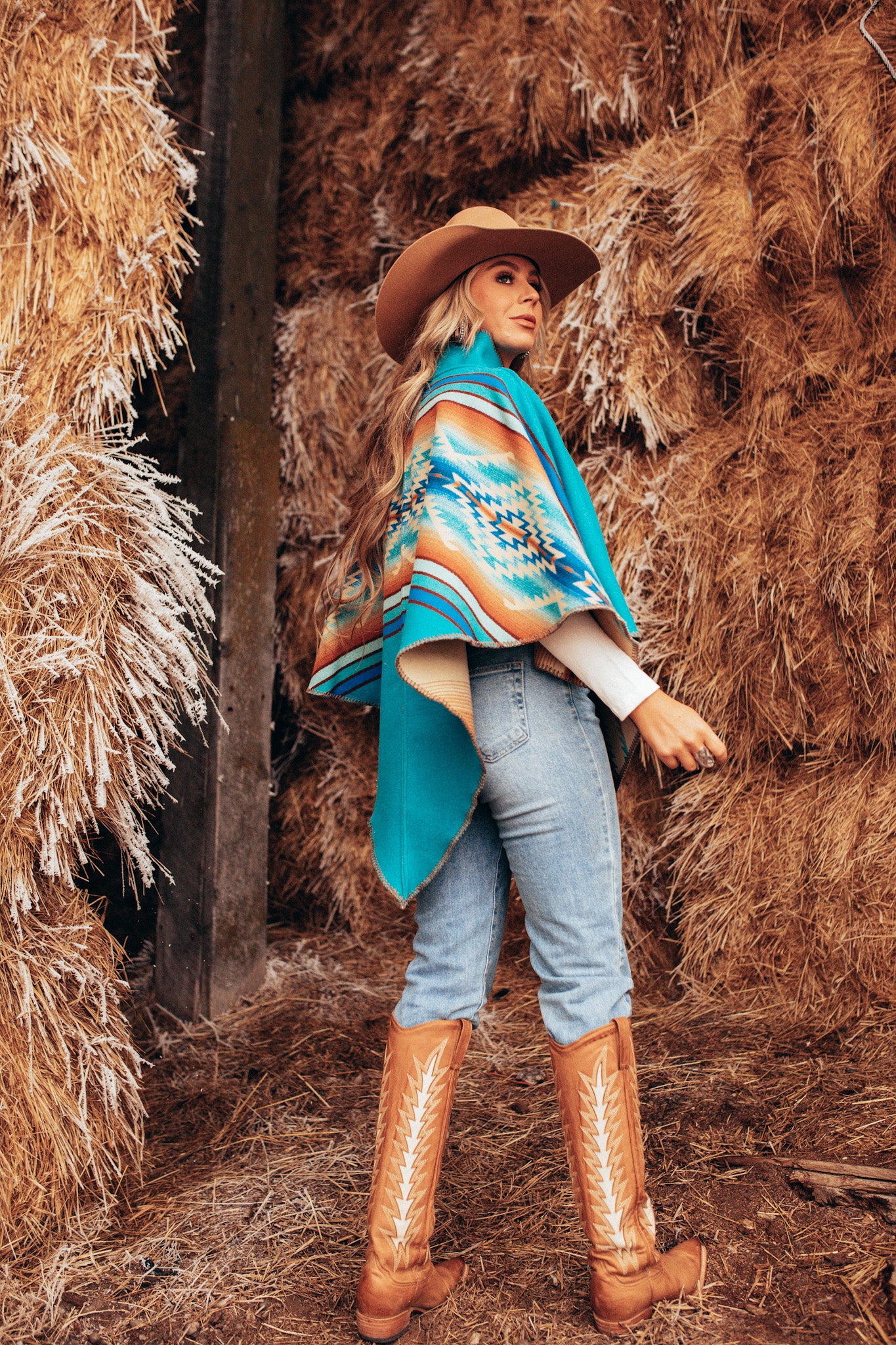 this poncho highlights the Pagosa design representing hot blue springs where Southern California Utes were known to bathe, rising through fire to bring health and peace. Pull this easy poncho over your head and you’re ready to go. Sleeveless and roomy for an easy-to-wear style. Open, breathable style with enough warmth to keep the chill away.