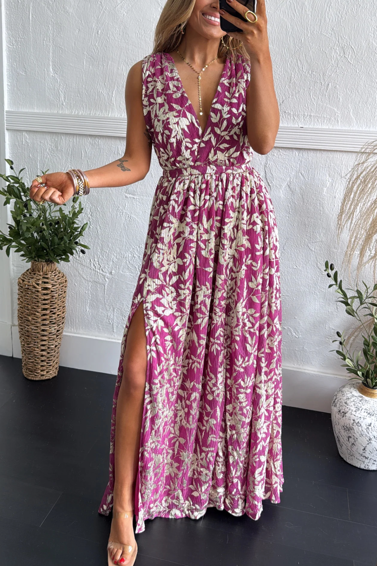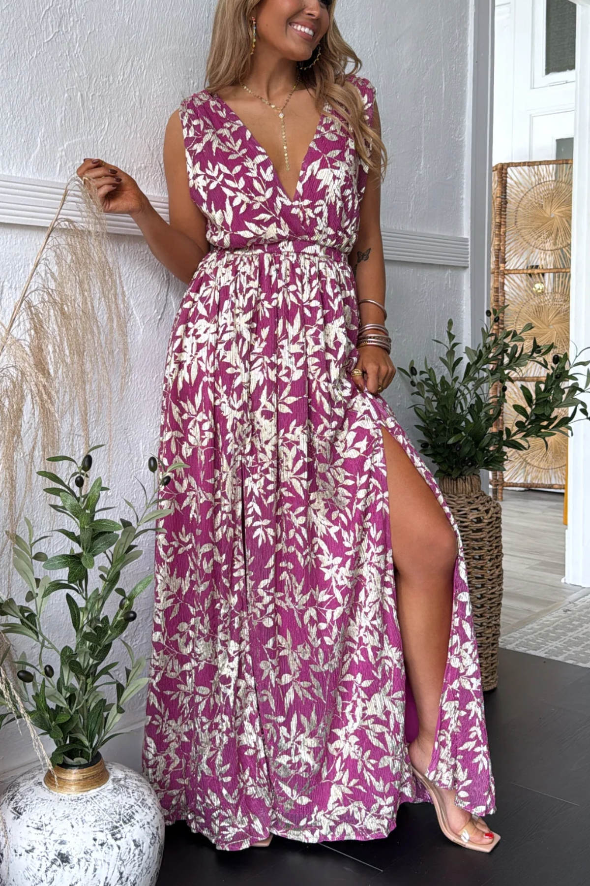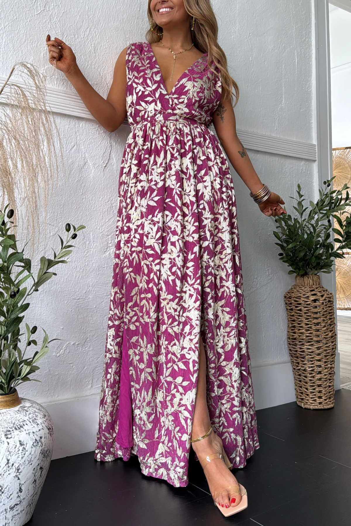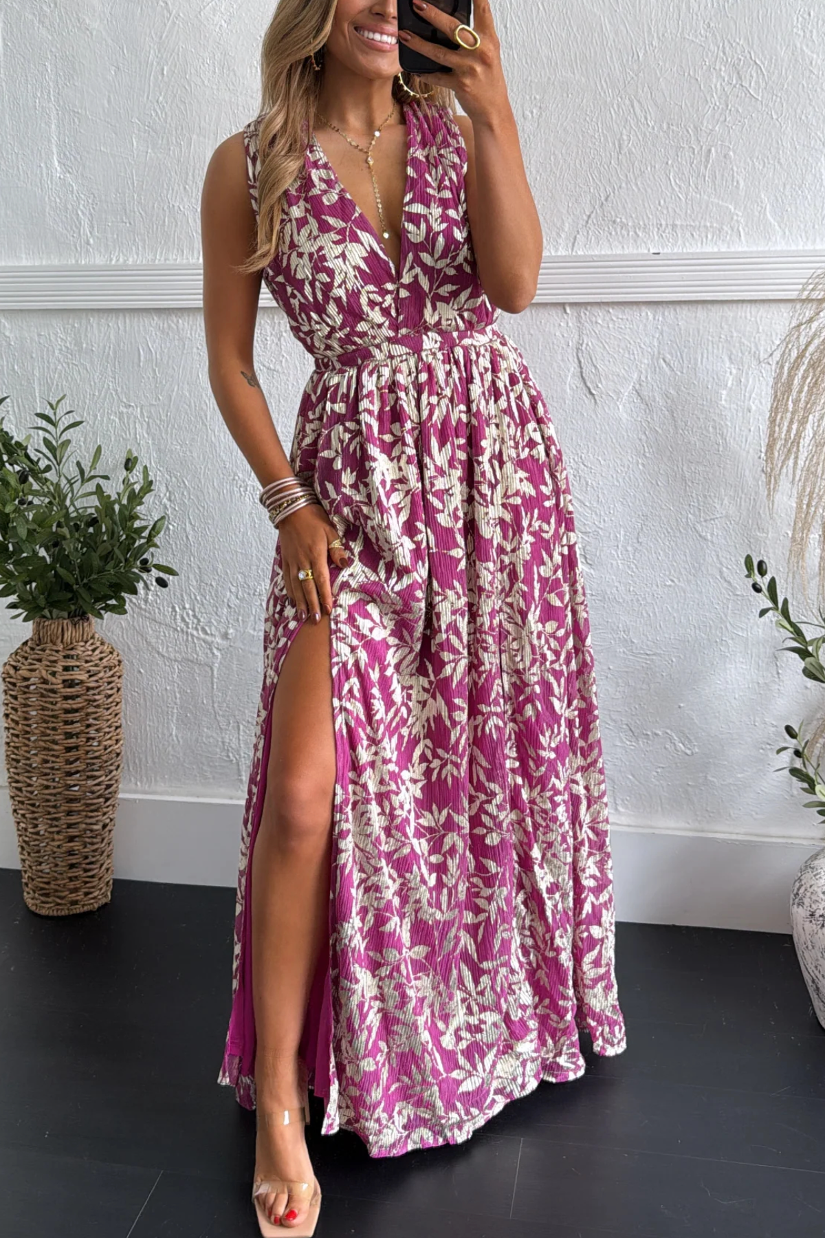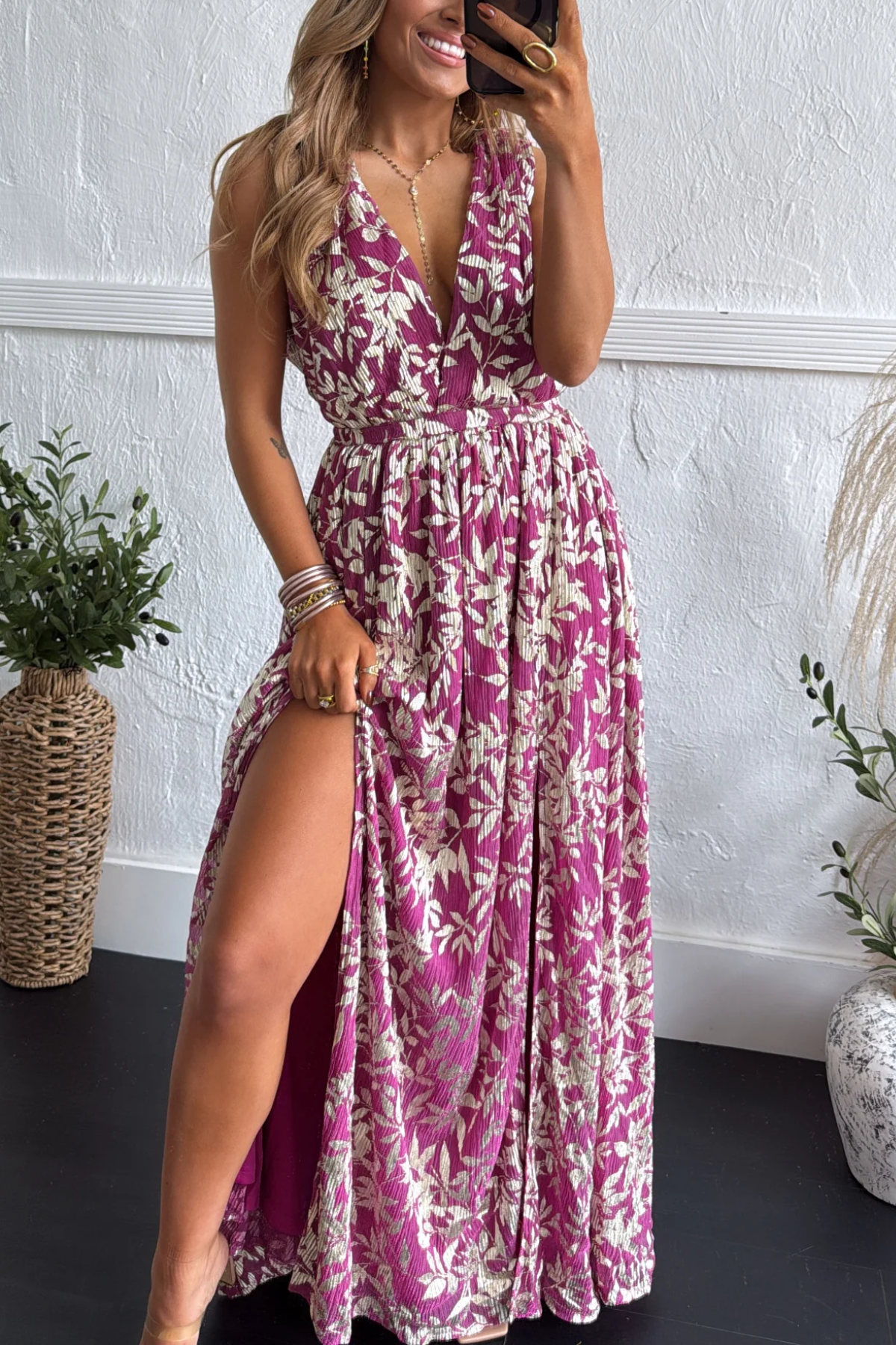 Feminine, flowy, and full of charm the Rosaline Plunge Maxi Dress is made for those special moments that call for effortless elegance. This stunning magenta maxi features a cream floral print and a flattering plunging neckline that adds just the right touch of romance. The elastic waistband defines your shape, while the lightweight, crinkled fabric moves beautifully with every step.