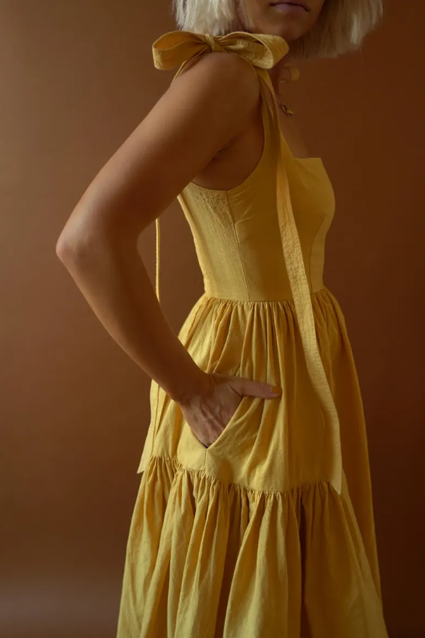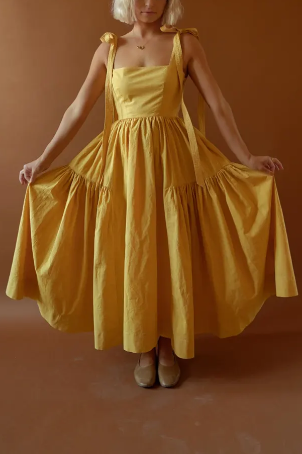 The fluffy, double-layered pleated skirt creates an airy feel when you move, retaining the elegance of vintage dresses while the relaxed fit reduces formality, making it perfect for everyday wear. The length is adjustable, allowing you to tie a bow for a sweet touch or adjust the tightness to suit different body types and shoulder shapes. The square neckline reveals the collarbone for a refined look, and the cinched waist naturally enhances the waist-to-hip ratio, offering some forgiveness around the midsection. The double-layered pleats add a sense of volume to the dress, but the lightweight fabric ensures comfort and unrestricted movement.