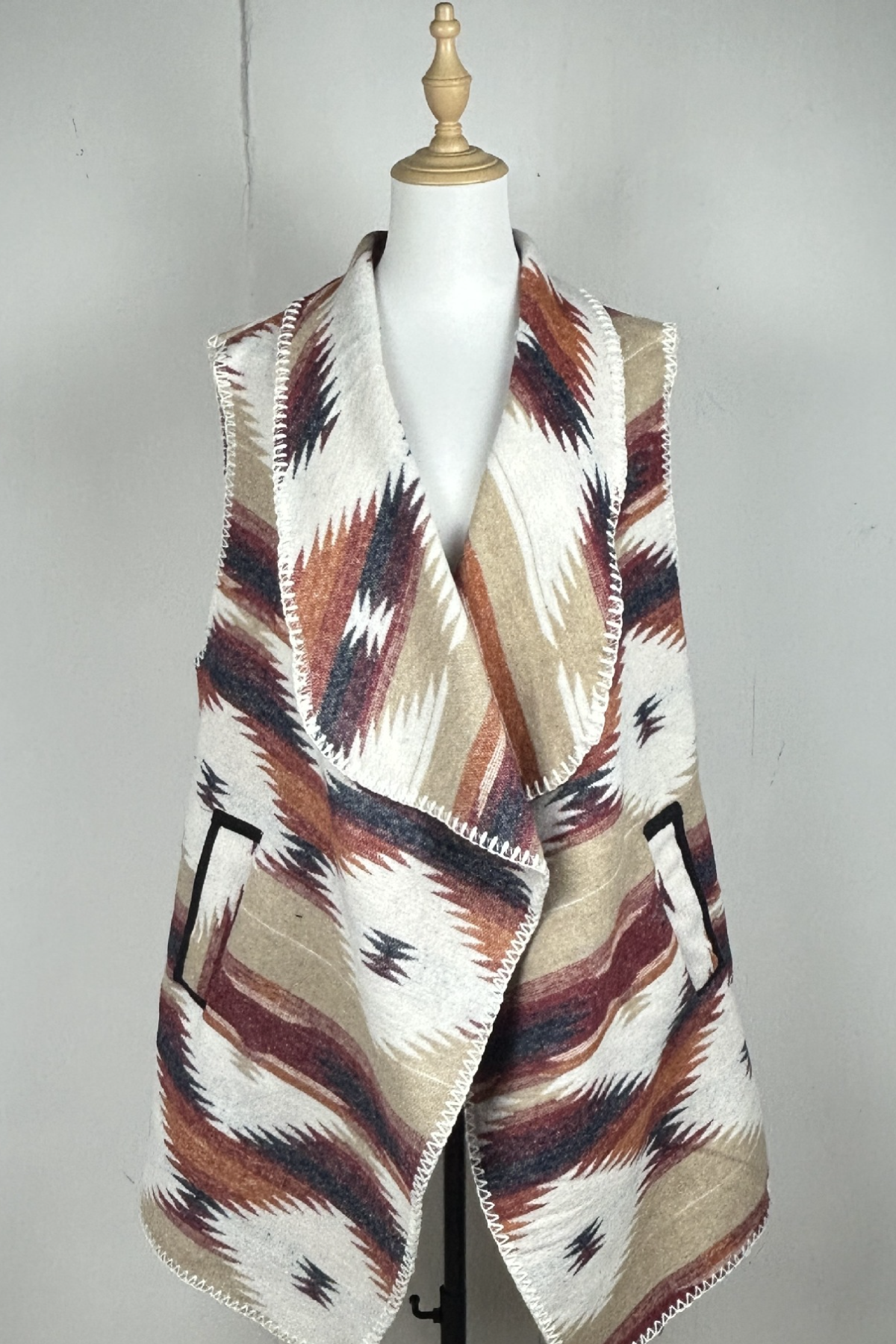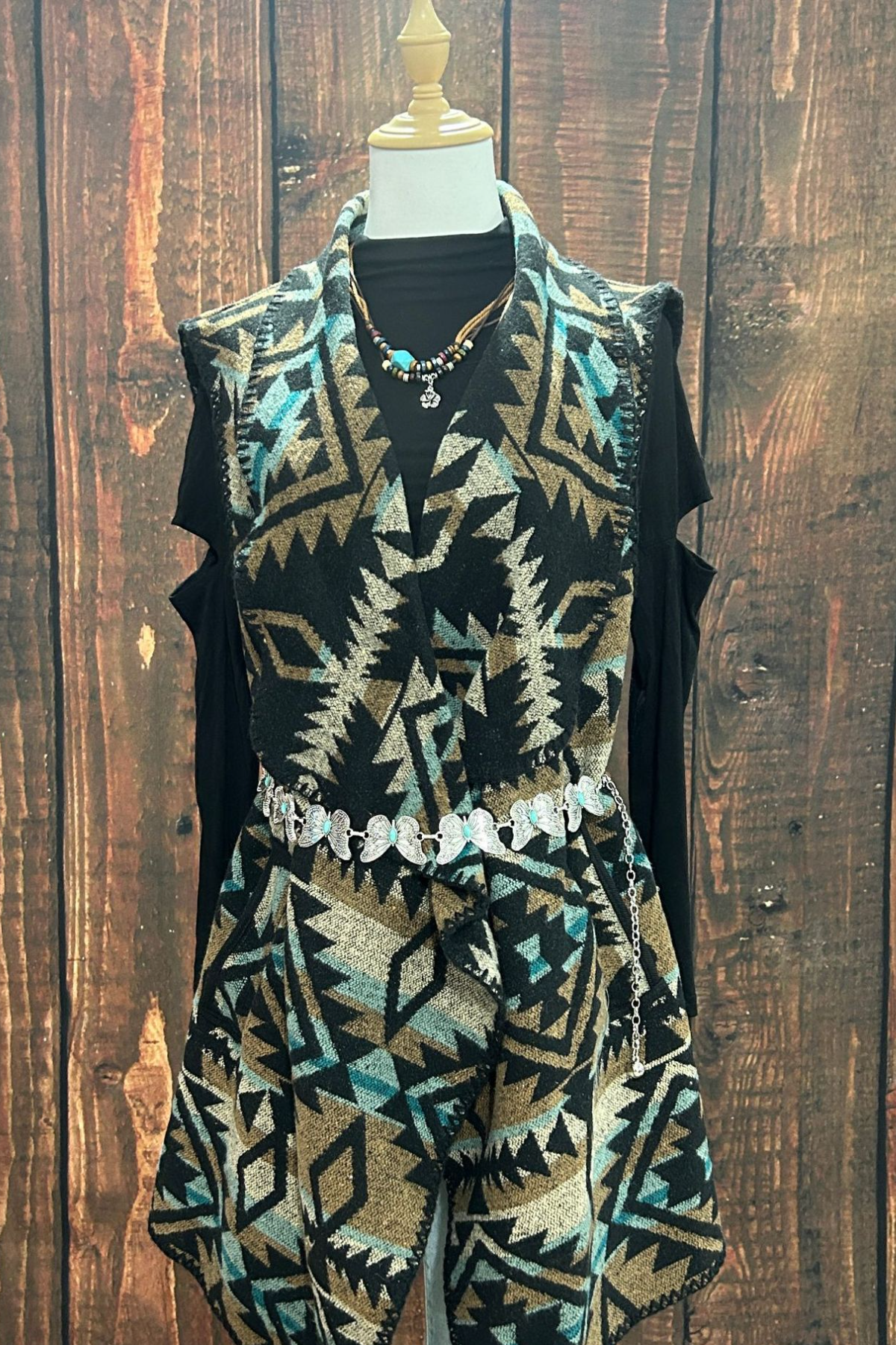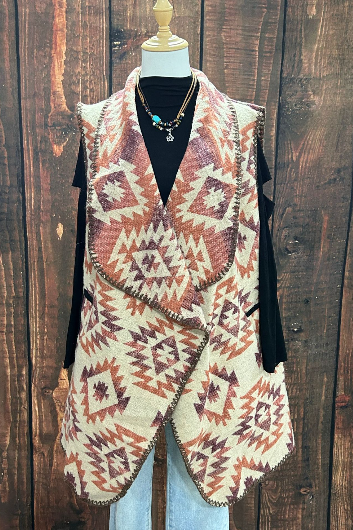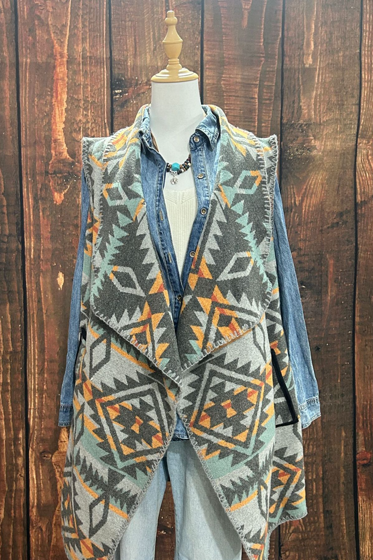 This vest features an ethnic geometric jacquard design, combining retro colors such as gray, orange, and blue to present a strong bohemian style. The sleeveless version with an irregular hem is casual and chic. It can be layered with a denim shirt and a knit inner top, making it rich in layers and versatile in style. Whether paired with jeans for a casual street look or with a dress for a romantic style, it can be easily managed, injecting a unique retro artistic sense into your outfit.