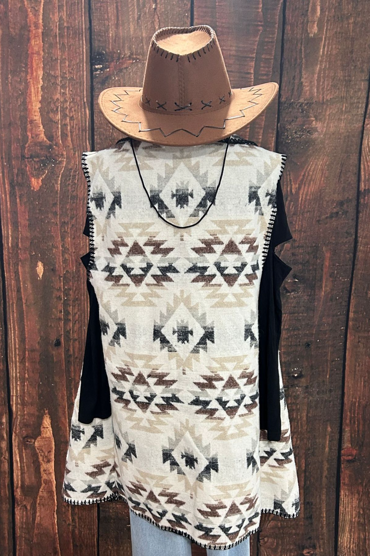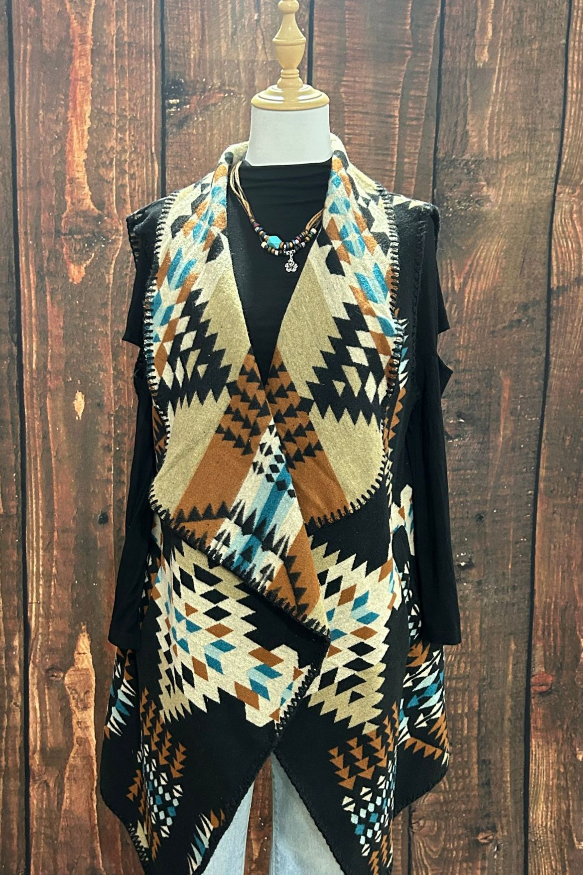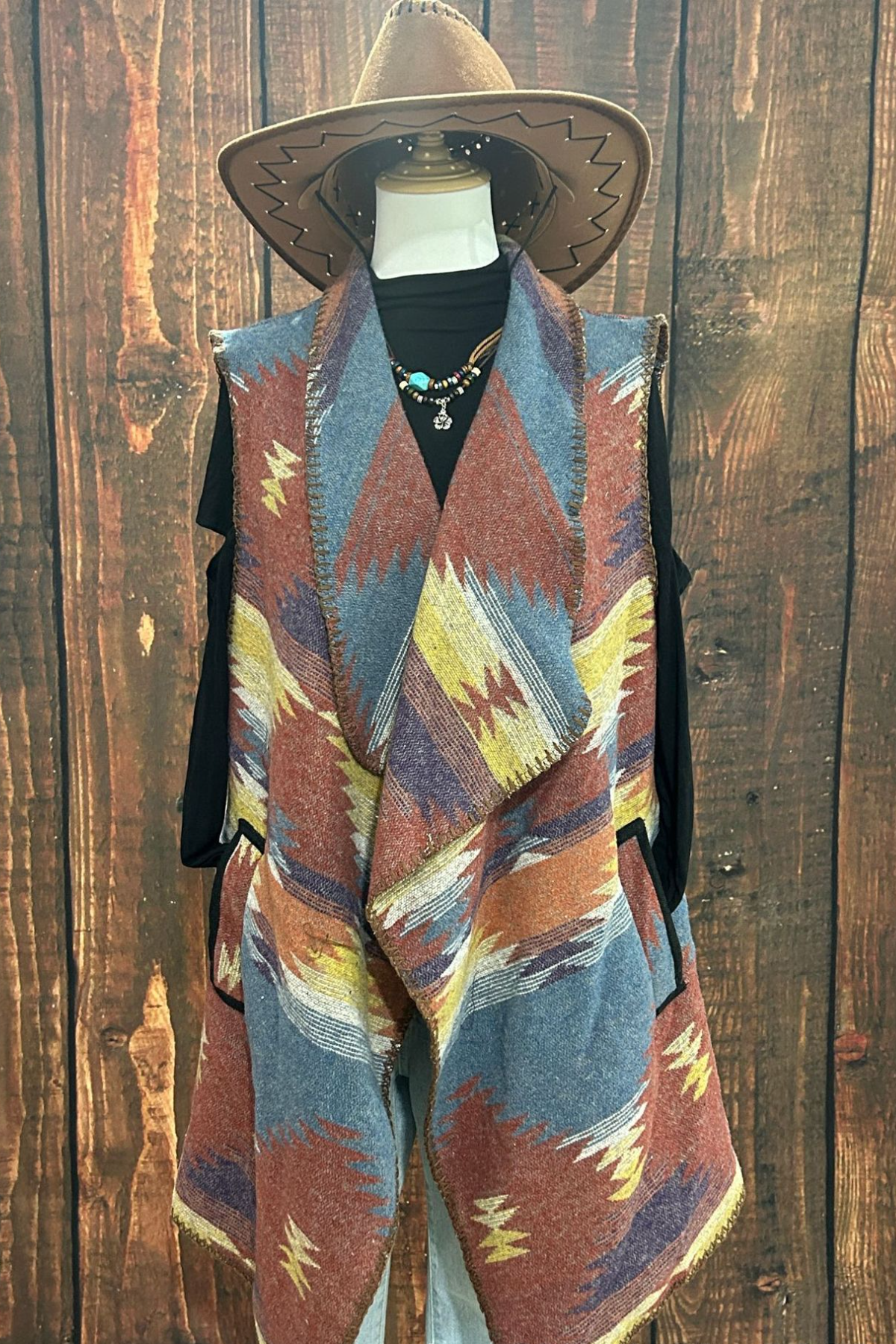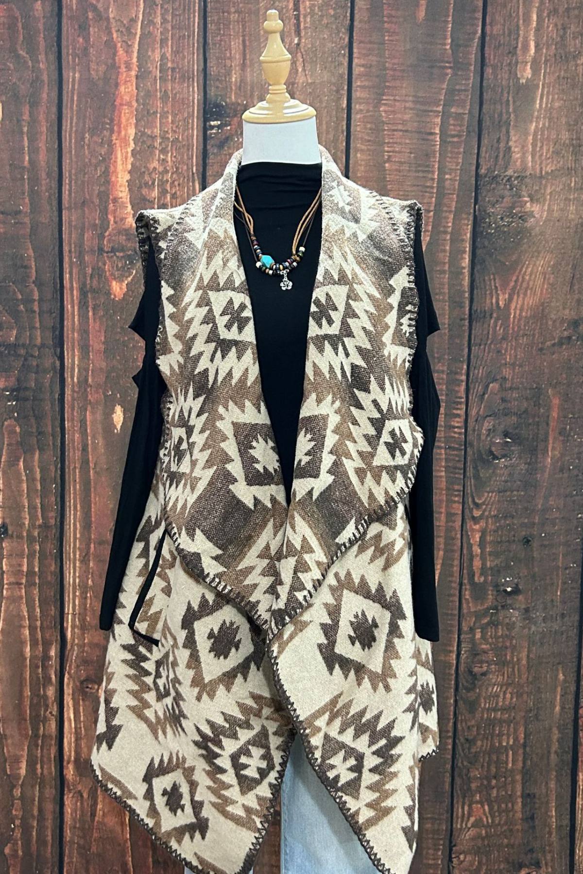 This vest features an ethnic geometric jacquard design, combining retro colors such as gray, orange, and blue to present a strong bohemian style. The sleeveless version with an irregular hem is casual and chic. It can be layered with a denim shirt and a knit inner top, making it rich in layers and versatile in style. Whether paired with jeans for a casual street look or with a dress for a romantic style, it can be easily managed, injecting a unique retro artistic sense into your outfit.