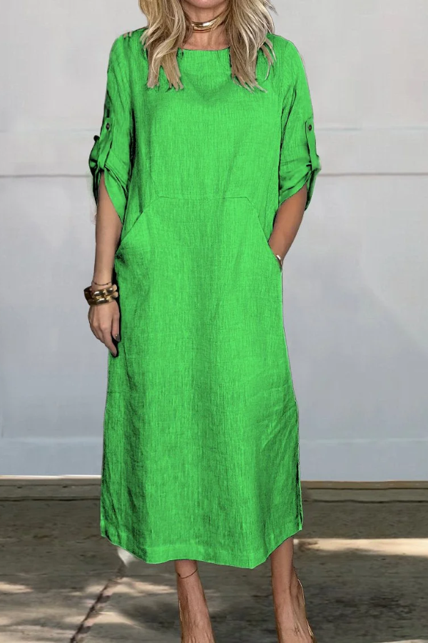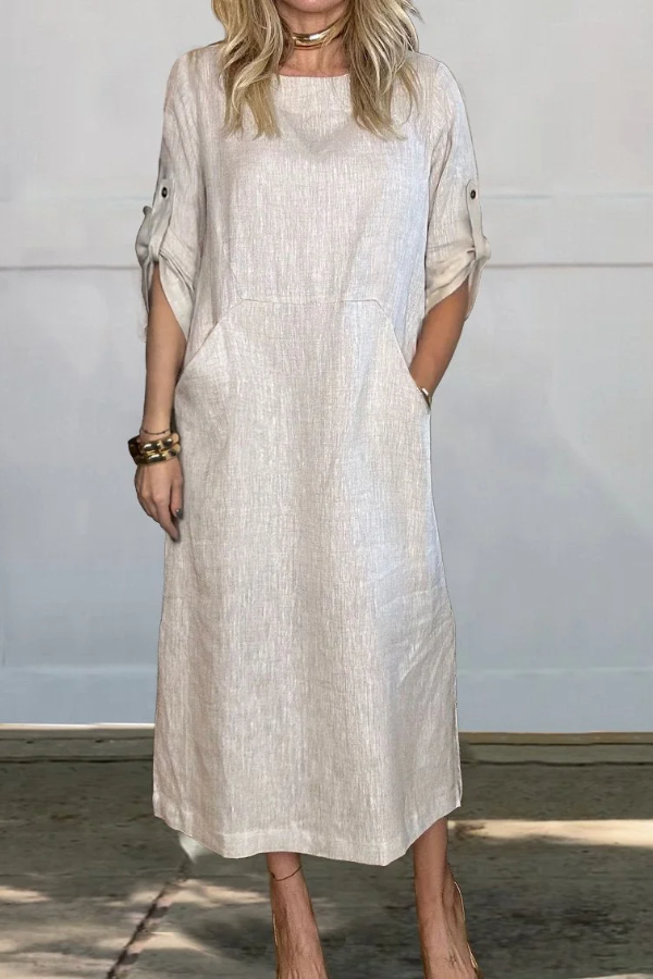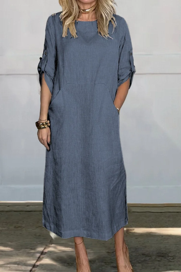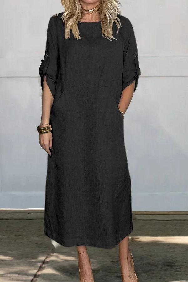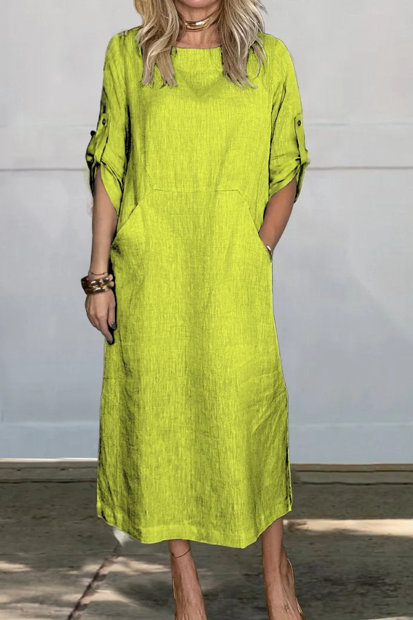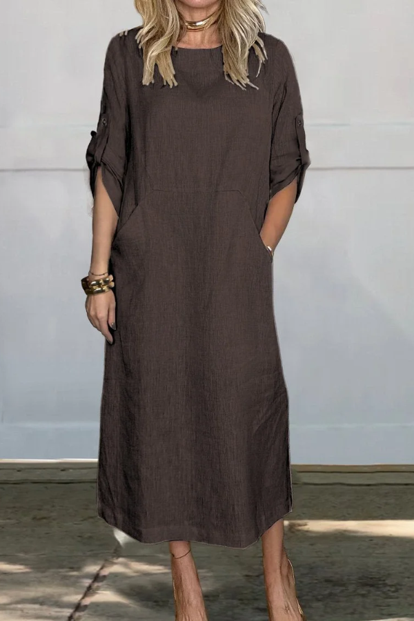 The classic round neckline flatters a wide range of face shapes while elegantly highlighting the collarbones; its minimalist aesthetic exudes an air of sophistication. Versatile and effortless to style, it pairs seamlessly with any accessory—making it a foolproof choice for any occasion. The figure-flattering straight-cut silhouette skims over the waist, midsection, and hips—making it particularly friendly to both "pear" and "apple" body types—and effortlessly creates a slender, "paper-thin" silhouette that feels relaxed, casual, and never restrictive. Falling to mid-calf length, the hemline not only visually elongates and refines the legs but also ensures ease of movement; it is perfectly appropriate for both professional commutes and daily wear, while the exposed ankles lend a sense of lightness and grace.
